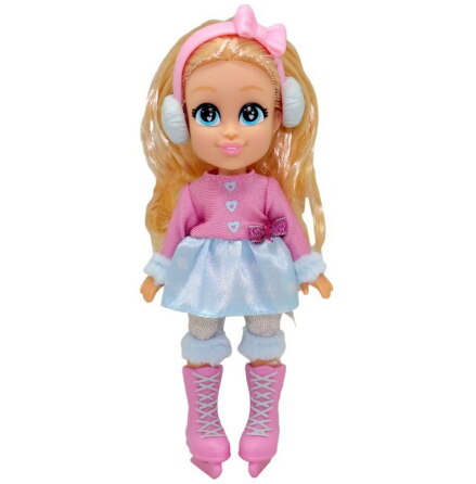 Tygdocka på 40 cm med långt brunt hår. Mjuk docka som bär en blå mössa med tofs, en blå kofta och blått linne, en blå kjol med blommigt mönster och blå sockor. Till tygdockan tillkommer även en söt hund med mössa.